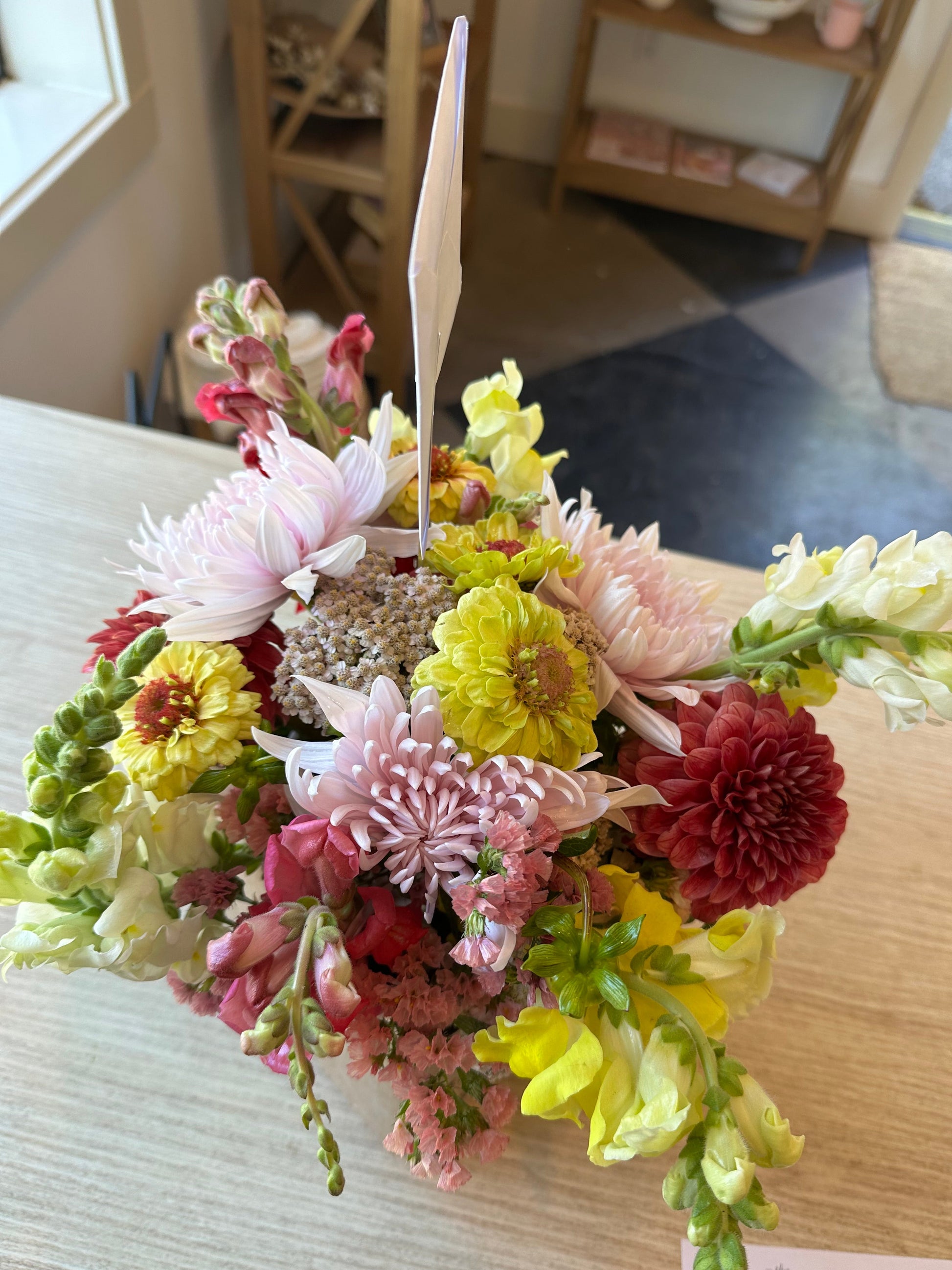 This is a sample of some flowers you may find in your large seasonal bouquet! The large minimum price is $75 and we can add on more flowers for a larger or custom arrangement. Vase arrangement available for an additional $25.